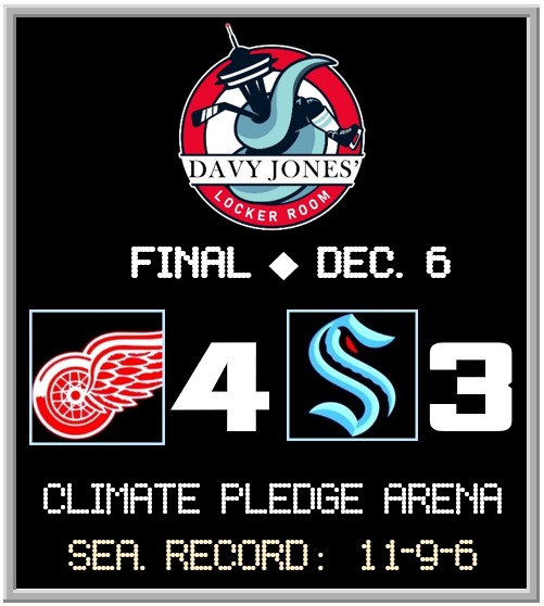 Montour made a third crowd-pleasing play in the dying seconds of the period, diving at the blue line to keep the puck in the Wings zone. Shots in the period are 8-6 Seattle.