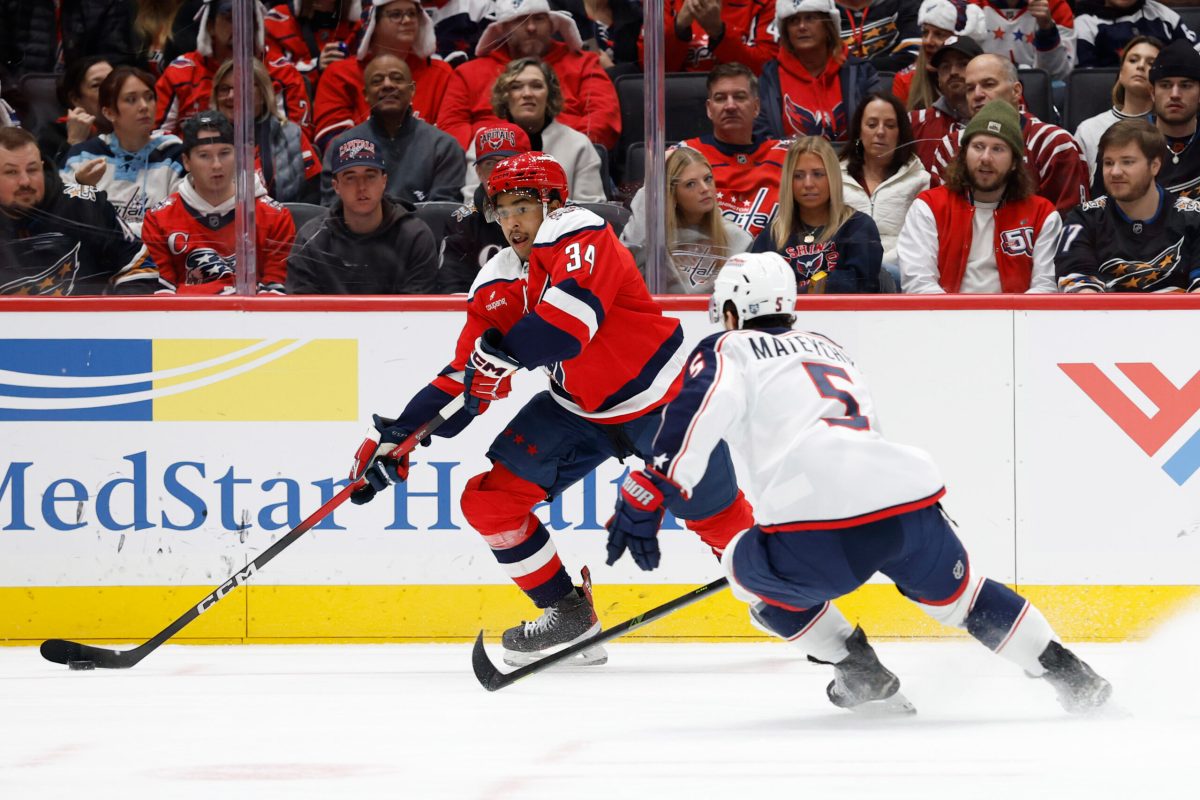 Dec 7, 2025; Washington, District of Columbia, USA; Washington Capitals right wing Justin Sourdif (34) skates with the puck as Columbus Blue Jackets defenseman Denton Mateychuk (5) defends during the first period at Capital One Arena. Mandatory Credit: Geoff Burke-Imagn Images