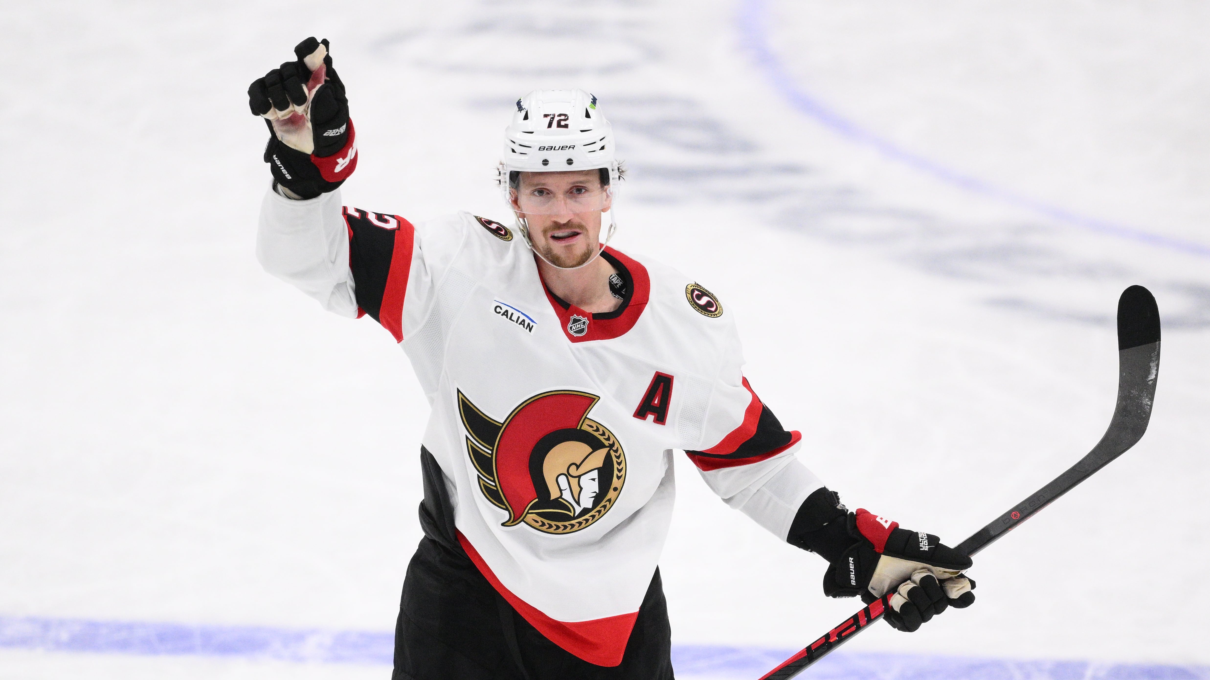 Ottawa Senators defenseman Thomas Chabot (72) celebrates his goal during the third period of an NHL hockey game against the Washington Capitals, Saturday, Oct. 25, 2025, in Washington. (AP Photo/Nick Wass) (Nick Wass/AP)