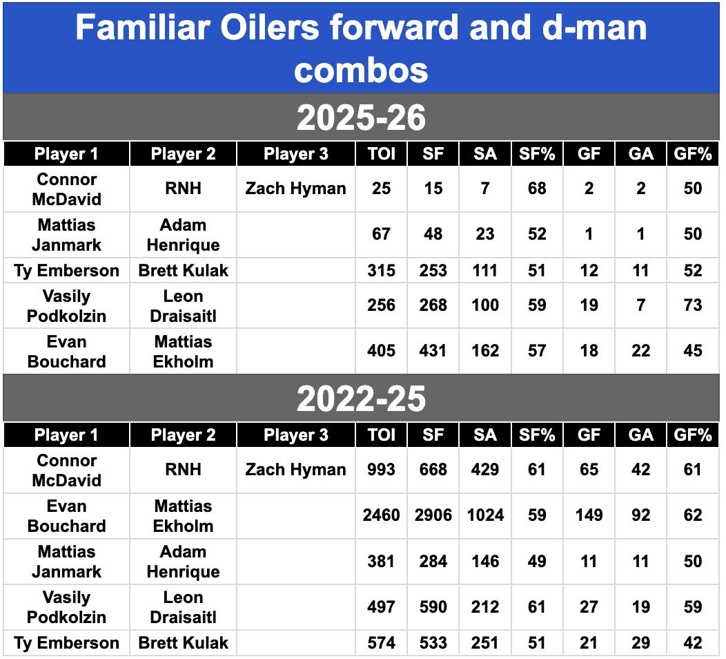 On the bottom-pairing, the Oilers have put Brett Kulak and Ty Emberson together, and the Oilers are again out-shooting the opposition when they’re on the ice, just as they did last year.