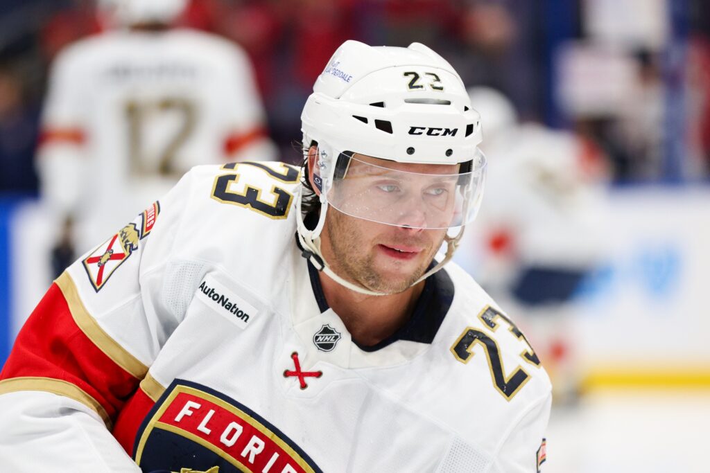 Oct 2, 2025; Tampa, Florida, USA; Florida Panthers center Carter Verhaeghe (23) warms up before a game against the Tampa Bay Lightning at Benchmark International Arena. Mandatory Credit: Nathan Ray Seebeck-Imagn Images