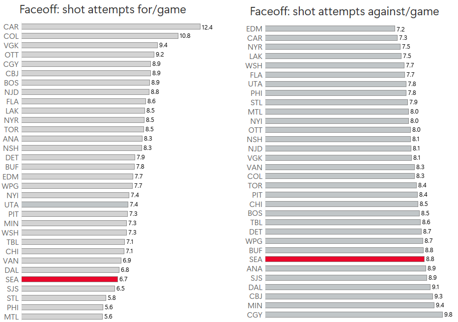 Face-offs continue to be an issue for the Kraken, and more specifically, what happens after the actual draw. The league doesn’t publicly track post-face-off possession, so I usually use shot attempts within 10 seconds of a face-off as a proxy. By that measure, Seattle ranks 28th in the NHL with 6.7 face-off shot attempts per game, and they sit 26th in allowing face-off attempts against. Not ideal.