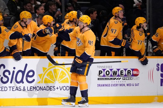 Nashville Predators left wing Reid Schaefer (49) celebrates his goal with teammates during the first period of an NHL hockey game against the Colorado Avalanche, Tuesday, Dec. 9, 2025, in Nashville, Tenn. (AP Photo/George Walker IV)