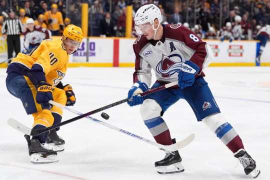 Colorado Avalanche defenseman Cale Makar (8) moves the puck past Nashville Predators center Fedor Svechkov (40) during the third period of an NHL hockey game Tuesday, Dec. 9, 2025, in Nashville, Tenn. (AP Photo/George Walker IV)
