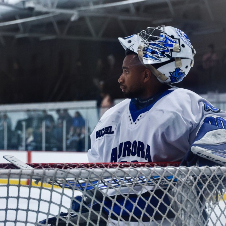 Shinnecock hockey player Skyler Coard plays goalie for Aurora University in Illinois. He’s weighing his options before he graduates in May 2026 with his master’s degree. Credit: Photo courtesy of the Coard family