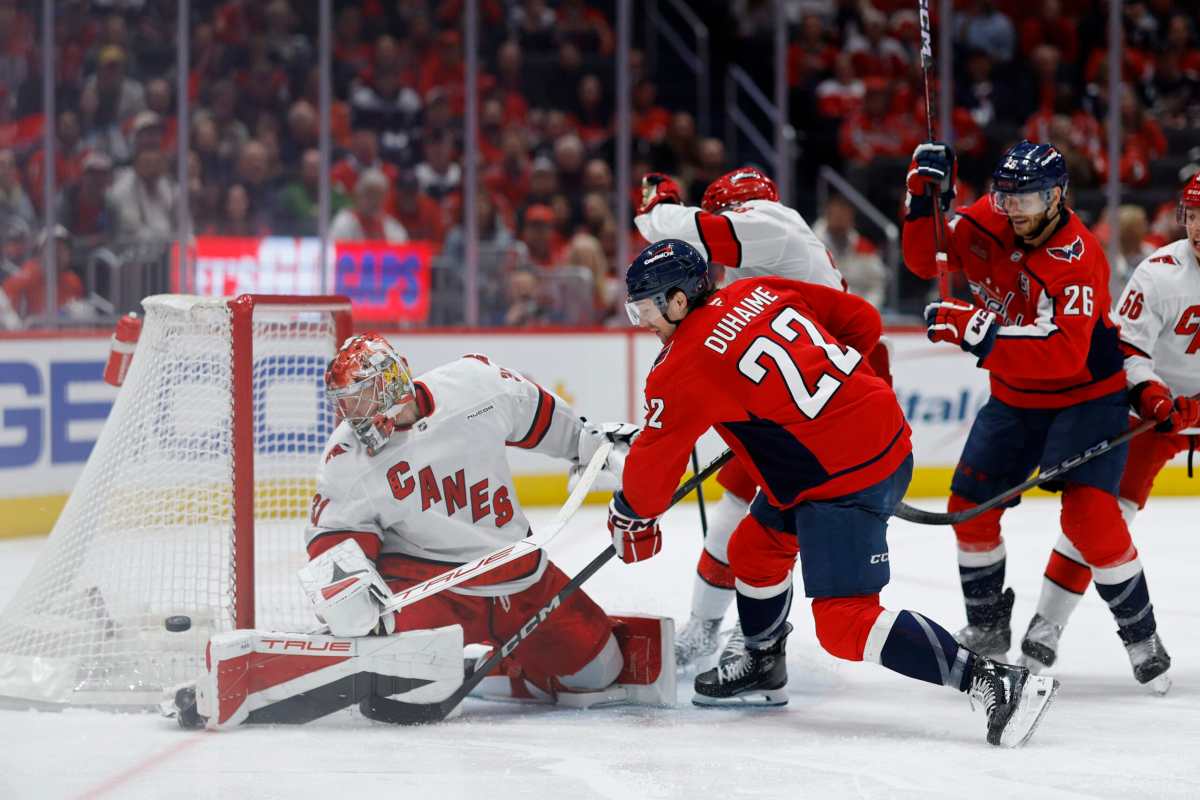Apr 10, 2025; Washington, District of Columbia, USA; Carolina Hurricanes goaltender Frederik Andersen (31) makes a save on Washington Capitals right wing Brandon Duhaime (22) in the third period at Capital One Arena. Mandatory Credit: Geoff Burke-Imagn Images