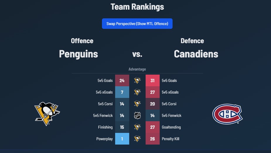 Montreal is allowing 3.55 goals against per game, among the very worst in the NHL. The Pens have been able to stack up shots and chances, and they’re coming off a 47 shot performance against Anaheim on Tuesday. Tonight could and probably should be more of the same with the Pittsburgh offense able dictate play and generate a ton of looks. The Canadiens haven’t been much to stop that this season, at 5v5 or 4v5. Whether or not the Pens can take advantage and finish on their chances will be a big determining factor in this game.