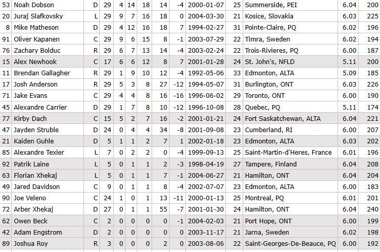 Injury games lost this season are way up so far this season, the Habs are no different there. Up front they have some notable and important losses to the lineup standing out as especially harmful.Evans is the latest on this list, officially he’s out for “personal reasons” tonight, RDS had reported Evans left the team to seek a foot specialist in Philadelphia.It seems like a lifetime ago (and 11 years in the NHL is basically that) where Mario Lemieux was pining over players like Brendan Gallagher when it came to the element the Pens were missing in 2014 when the brass fired Ray Shero. Gallagher is still “only” 33 years old, though he, Anderson (31) and Matheson (31) are the only 30+ year old players on what is still a very young Montreal team from top to bottom.21-year old Jacob Fowler has been recalled from the AHL in goal, and judging from these stats below you can see why that would be. Montembeault has never carried a strong save percentage but his work on goals saved above average was very strong last year. That isn’t the case this time around. 24-year old Dobes has provided some ‘flash in the pan’ type of help in the past but has struggled with a bigger workload this season. Fowler would be making his NHL debut tonight if he sees action.As of yesterday, coach Martin St. Louis wouldn’t confirm when Fowler will make his NHL debut, so that might be worth tracking this morning if official word will come out. Given that both Montembeault and Dobes gave up three goals a piece (on 13 or 14 shots) last game points towards giving the fresh-faced rookie a chance. Hard to imagine that they’ve called him up to have him watch the other struggling goalies..