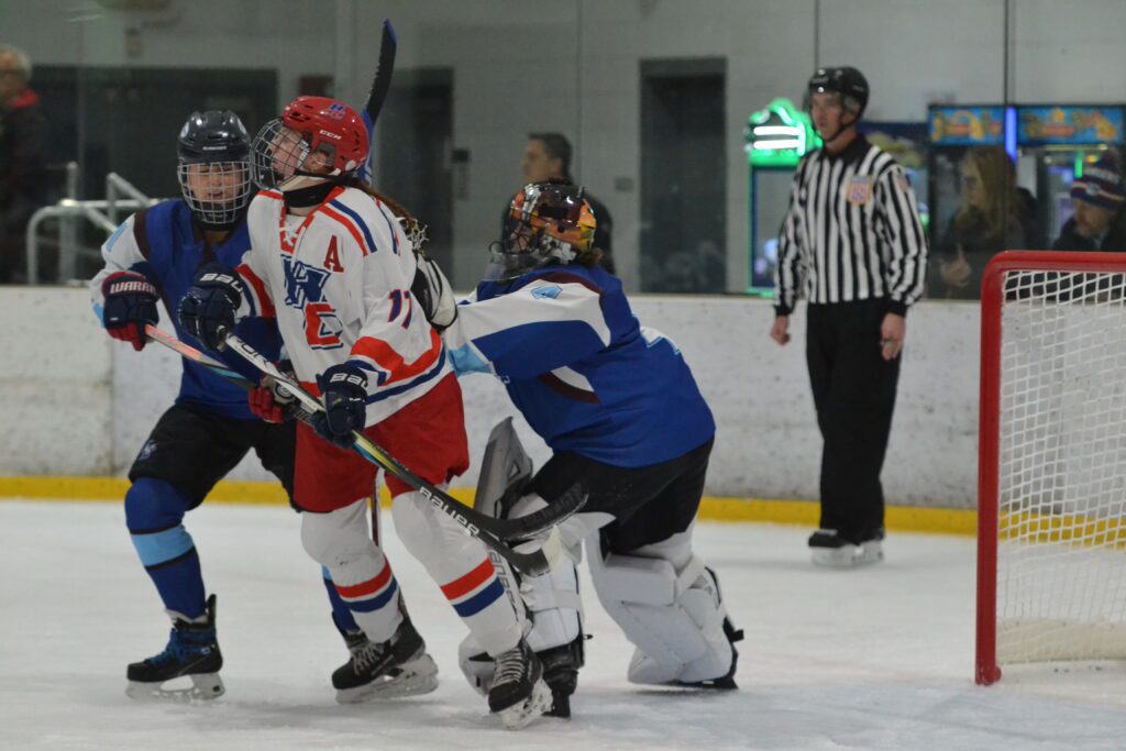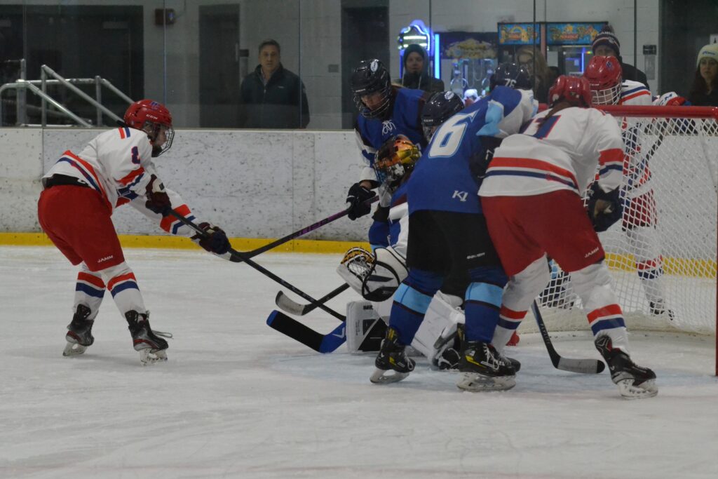 Avery Selstad tried to bang home the rebound. Hall/Conard vs. East Catholic girls hockey. Dec. 10, 2025. Photo credit: Paul Palmer