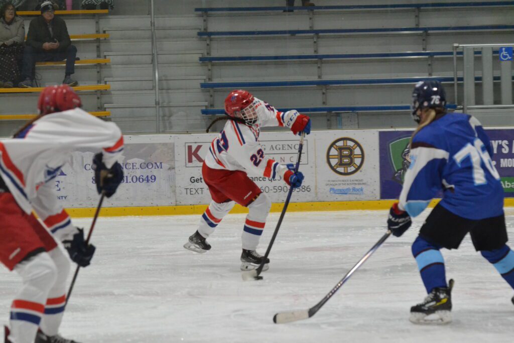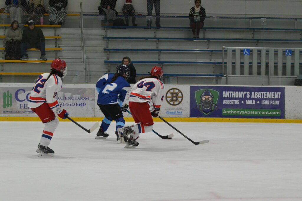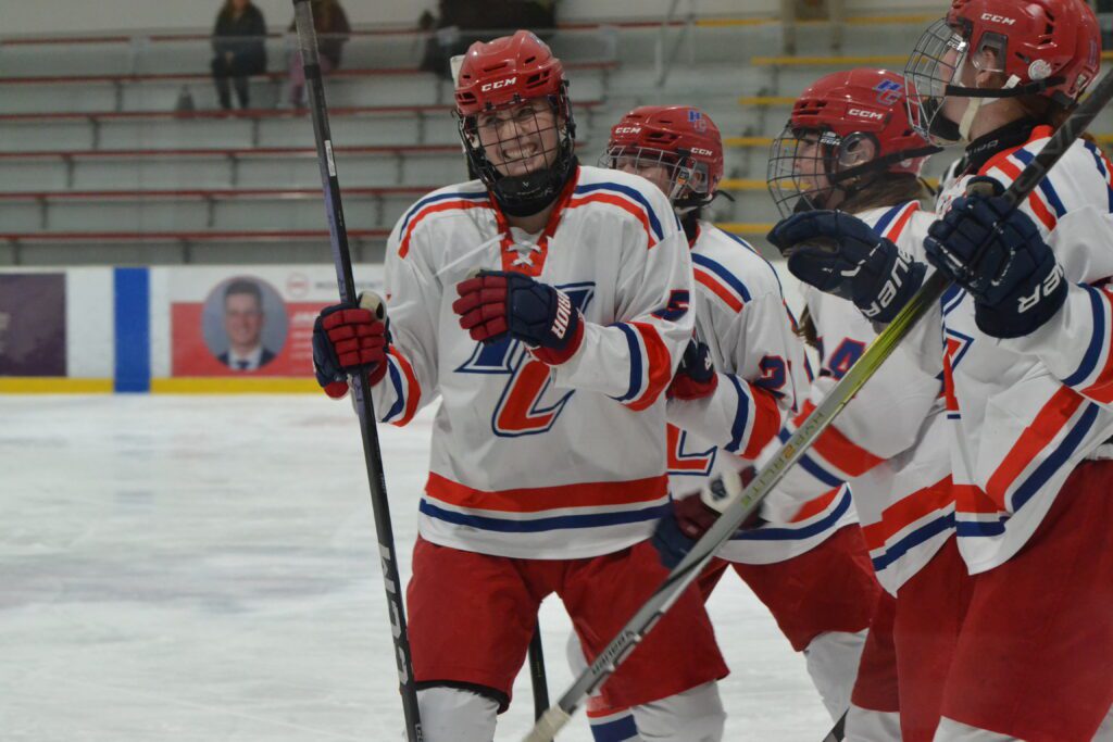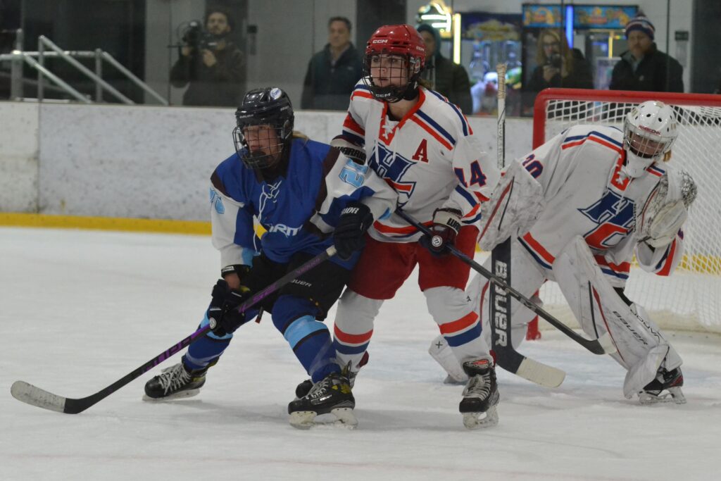 It took the visitors just 2:49 to get on the scoreboard. Charlotte Laramee intercepted a pass along the blue line and skated out in a 2-on-1 with teammate Deidre McKiernan. Laramee’s pass went off a defenseman and then McKiernan managed to push it back to her teammate who scored.