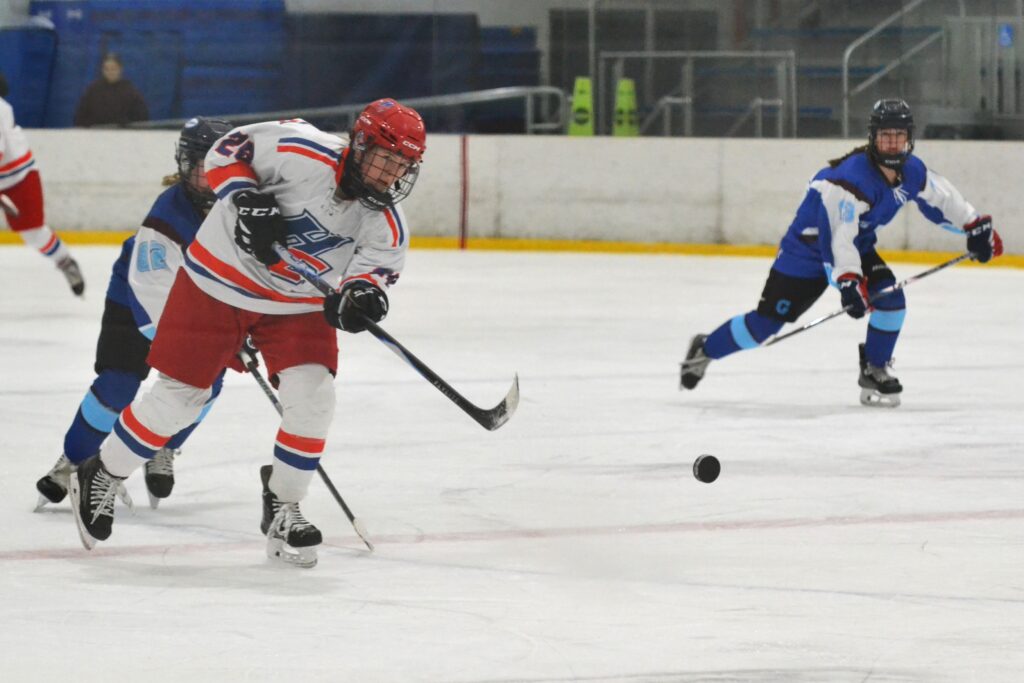 Katie O’Keefe dumps the puck in. Hall/Conard vs. East Catholic girls hockey. Dec. 10, 2025. Photo credit: Paul Palmer