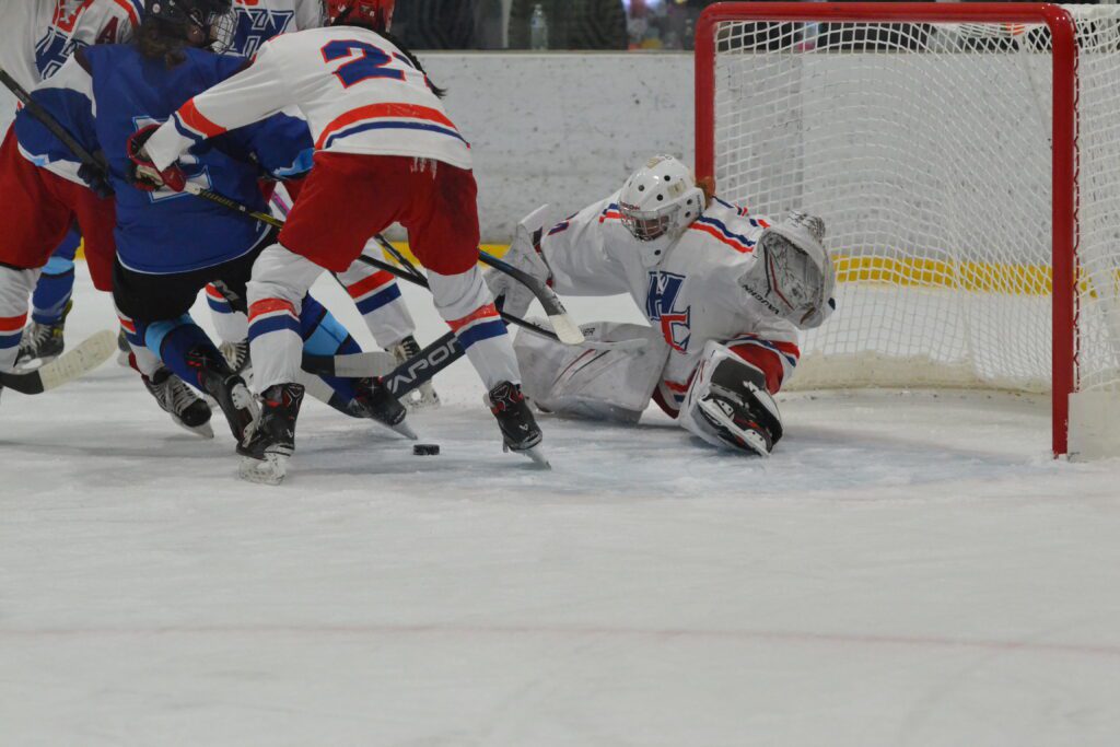 Lauren Busi gets big in goal around the loose puck. Hall/Conard vs. East Catholic girls hockey. Dec. 10, 2025. Photo credit: Paul Palmer