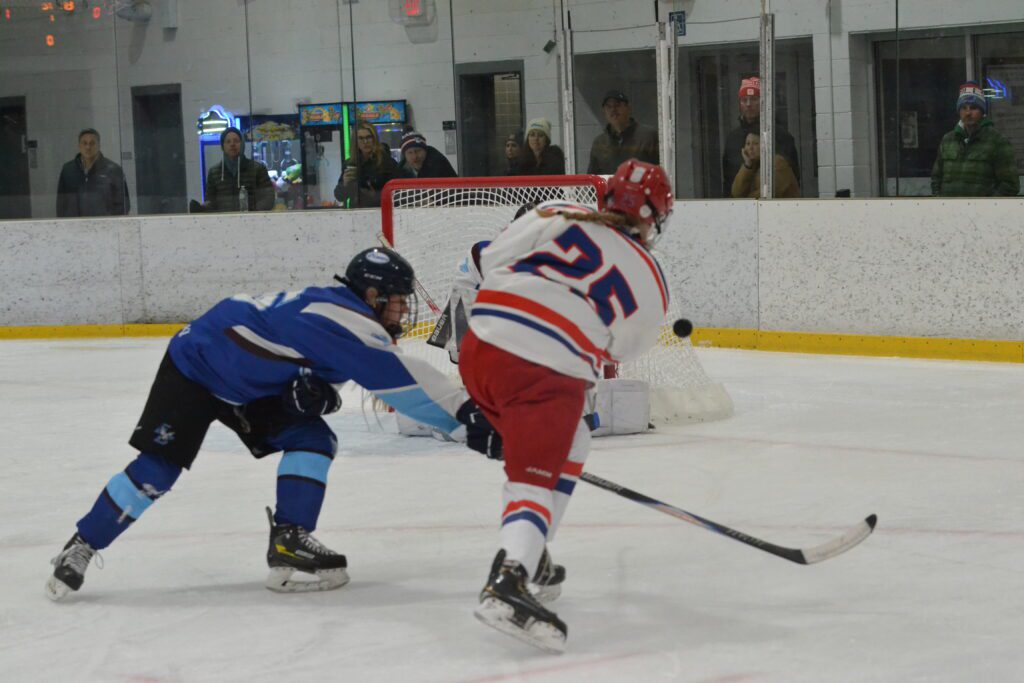 Maddie Bean’s shot is deflected wide. Hall/Conard vs. East Catholic girls hockey. Dec. 10, 2025. Photo credit: Paul Palmer