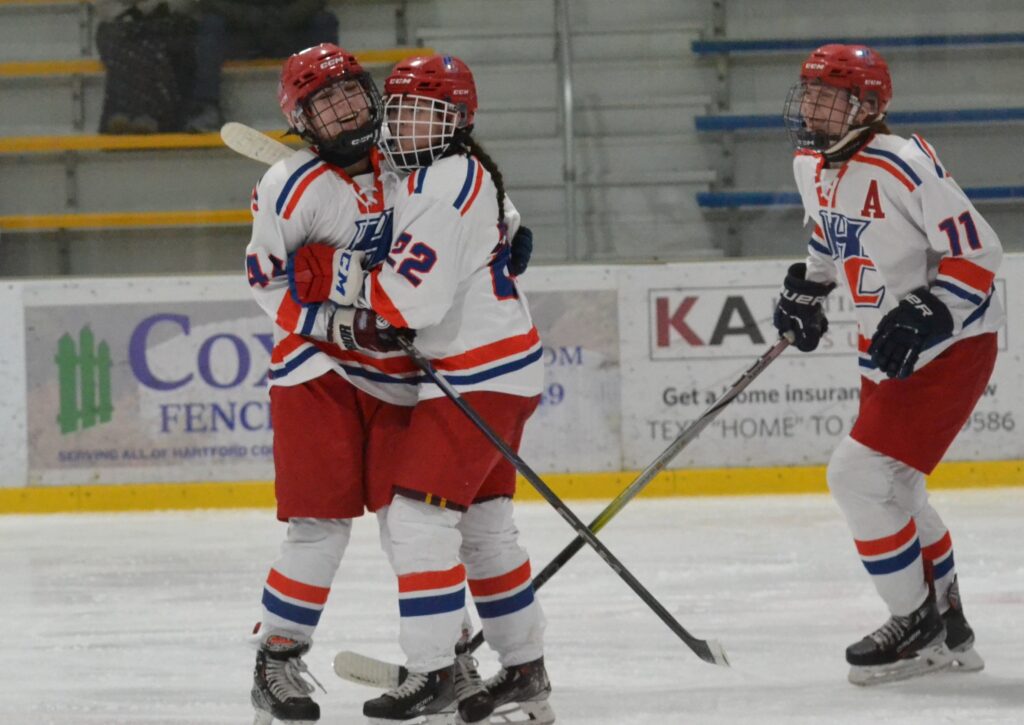 Teagan Cohane (22) celebrates with Fiona Campbell (44) after tipping in her shot. Mia Longman (11) joins in. Hall/Conard vs. East Catholic girls hockey. Dec. 10, 2025. Photo credit: Paul Palmer