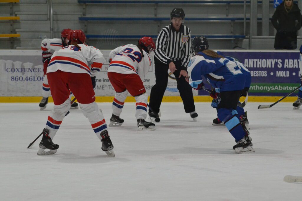 Teagan Cohane (22) controls the face off. Hall/Conard vs. East Catholic girls hockey. Dec. 10, 2025. Photo credit: Paul Palmer