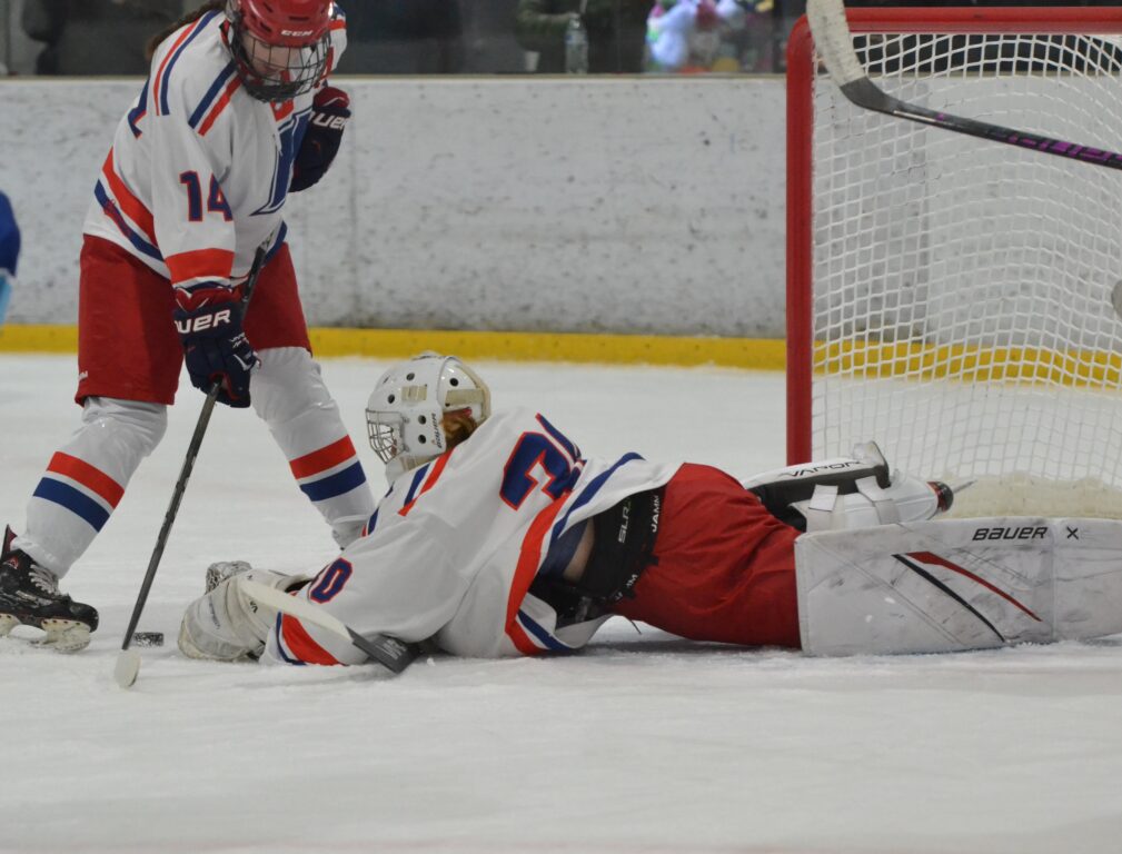 The home team had a better start to the second period forcing Maynard to make an early save on a point shot and then denying Sweeney’s chance on the doorstep on a feed from Cohane coming out from behind the net. Just under halfway through, East Catholic would pick up its second of the game. After controlling an offensive zone faceoff, Dudzinski sent the puck behind the net where McKiernan picked it up. She came around the left side of Busi’s net and tried the backhander, which was stopped. The rebound sent right in front of the net and as Busi dove for it, Dudzinski beat her to the puck and punched it in for the goal.