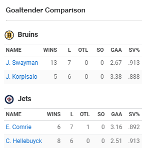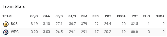 Lets jump to a look at Winnipeg & Boston’s seasons by checking out ESPN‘s team & goaltender comparison numbers: