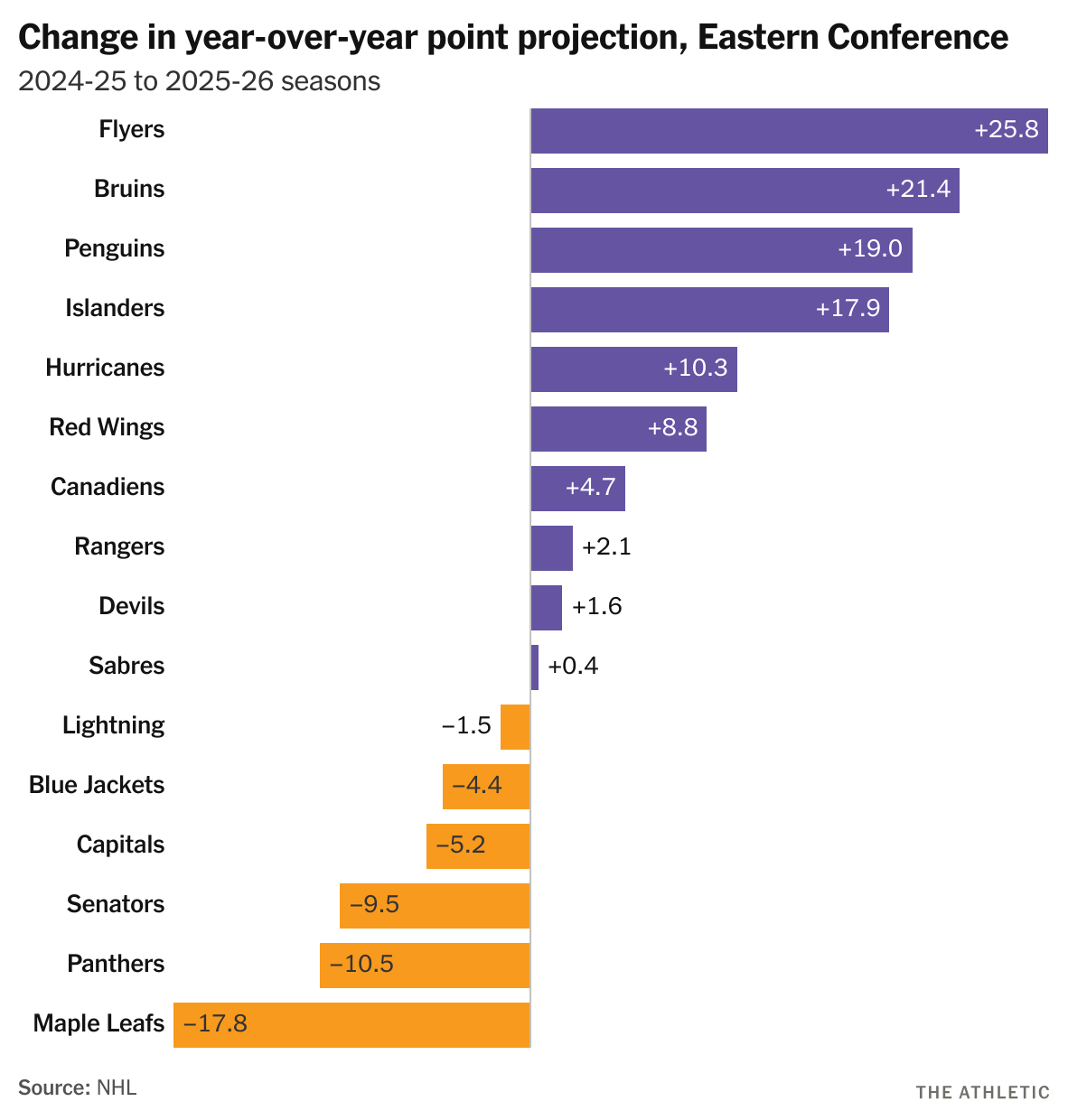 How can the East be better, even with a team like the Avalanche piling up W’s? Depth. Other than Buffalo, absolutely every team is in the mix, and sharp rises for unexpected teams like the Flyers, Penguins and Islanders mean the majority of the conference is a 95- to 100-point threat.