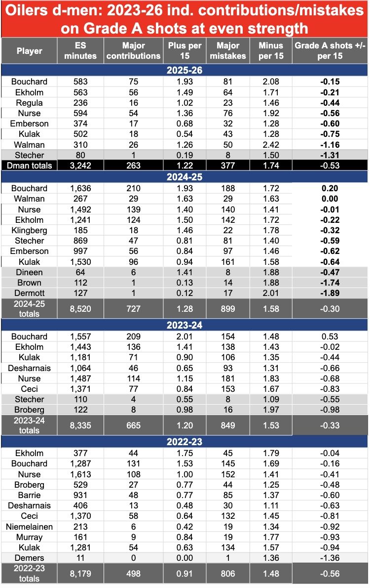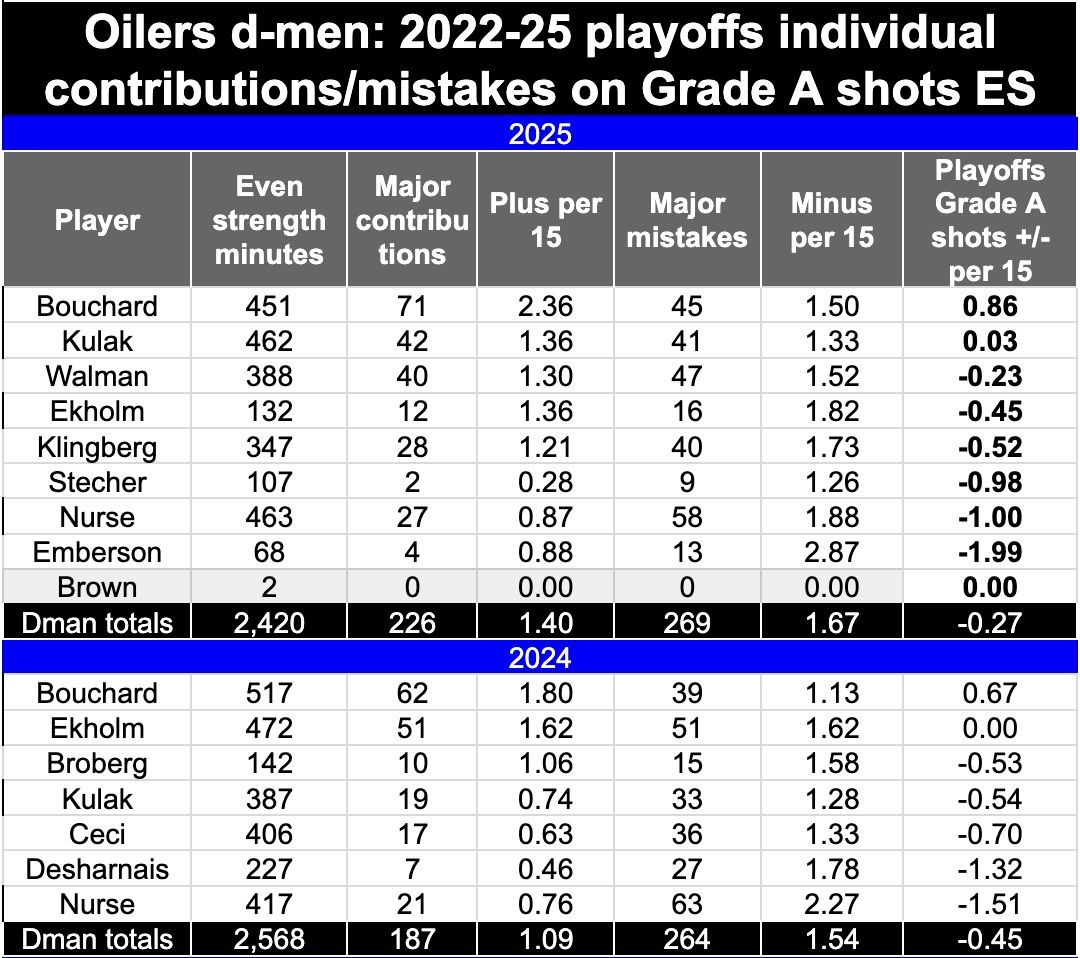 You can see Kulak’s playoff prowess in his excellent Grade A shots plus-minus metrics. He was the second best Oilers d-man in the playoffs last year after Evan Bouchard, and the fourth best in 2024 after Bouchard, Mattias Ekholm and Philip Broberg.