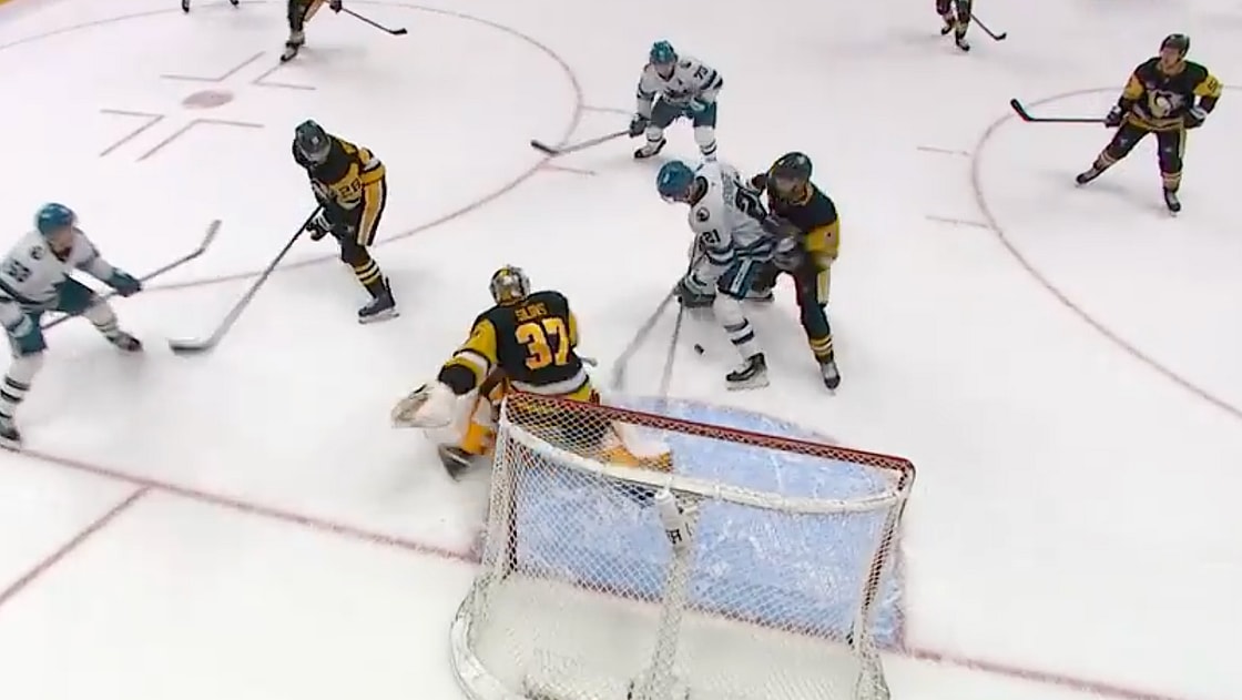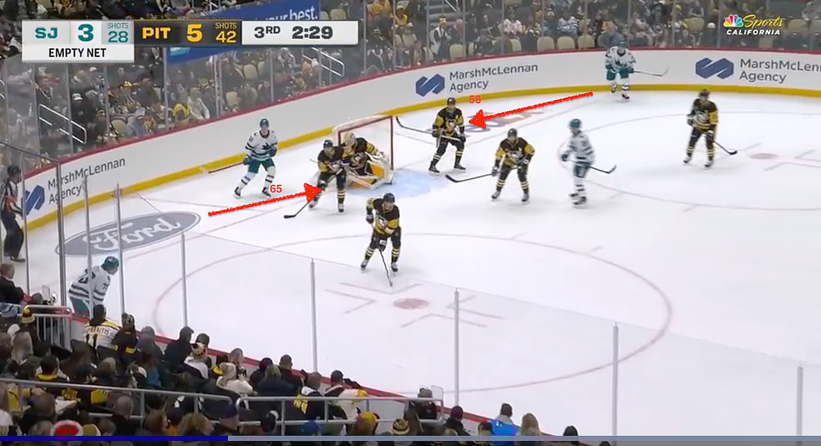 Macklin Celebrin scored while a pair of Sharks forwards went to the net to screen goalie Arturs Silovs, and did so with no resistance from Letang or Karlsson. In Picture 1, the Penguins have the Sharks confined to the perimeter. All should have been safe and sound, but two seconds later, the Penguins’ defensemen hadn’t moved, but two Sharks were squarely in front of the crease, easily taking the inside position.