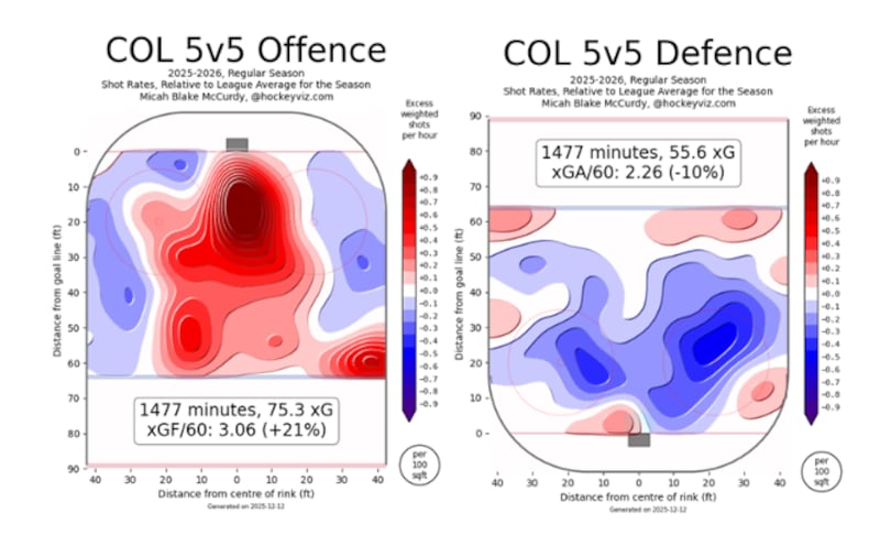 The counting numbers speak for themselves with this Colorado team: MacKinnon (55 points) and Martin Necas (43 points), both sit inside the top five of the scoring race. Cale Makar, as usual, leads all league defencemen in scoring (38 points). And while the Avalanche’s depth has been key to their success, the outperformance you’re seeing is because the team’s best units are pulverizing the competition.