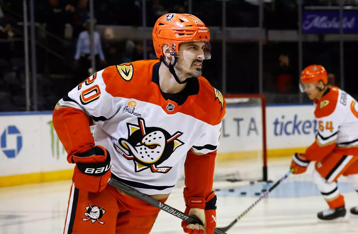 Anaheim Ducks left wing Chris Kreider (20) skates during warmups before an NHL hockey game against the New York Rangers, Monday, Dec 15, 2025, in New York. (AP Photo/Noah K. Murray)