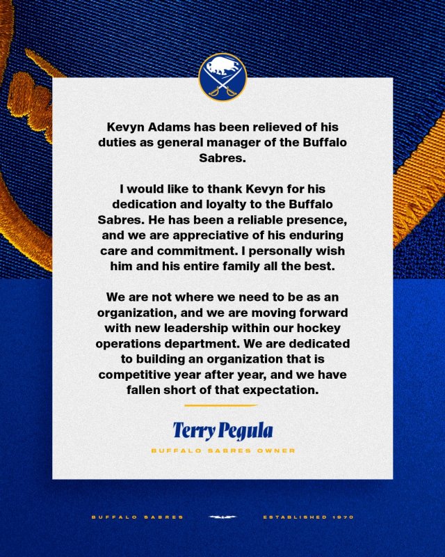 “Kevyn Adams has been relieved of his duties as general manager of the Buffalo Sabres.