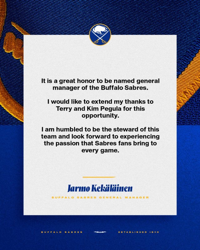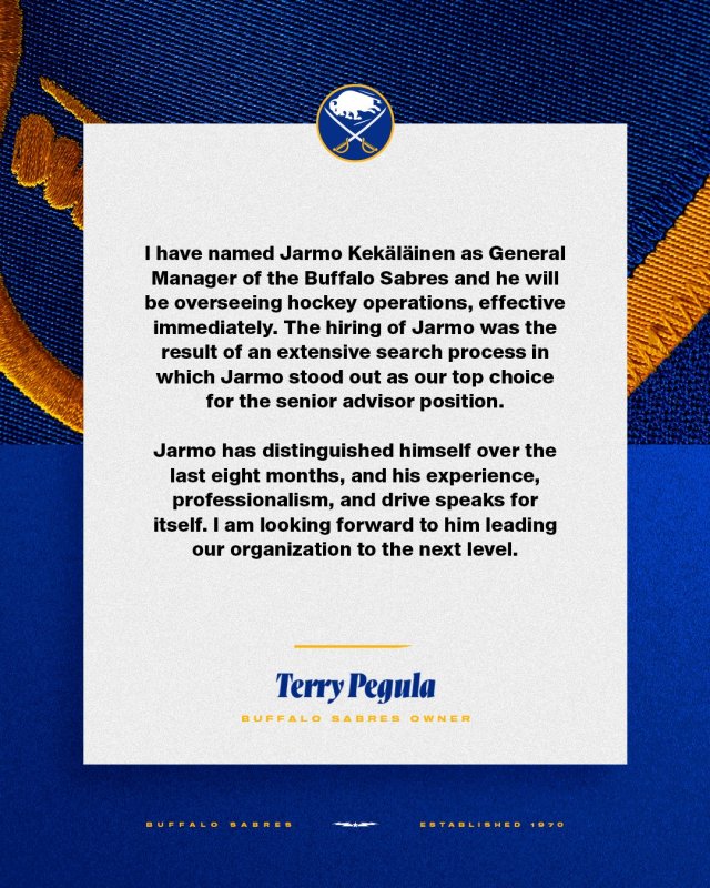“I have named Jarmo Kekäläinen as general manager of the Buffalo Sabres and he will be overseeing hockey operations, effective immediately. The hiring of Jarmo was the result of an extensive search process in which Jarmo stood out as our top choice for the senior advisor position. Jarmo has distinguished himself over the last eight months, and his experience, professionalism, and drive speaks for itself. I am looking forward to him leading our organization to the next level.”