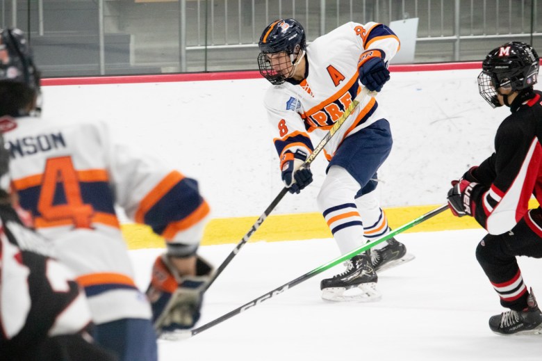 Liam Moroney (left in orange) of the Oak Park-River Forest High School hockey club in action during a game this season. (Provided by Jason Clary and Dylan Clary)