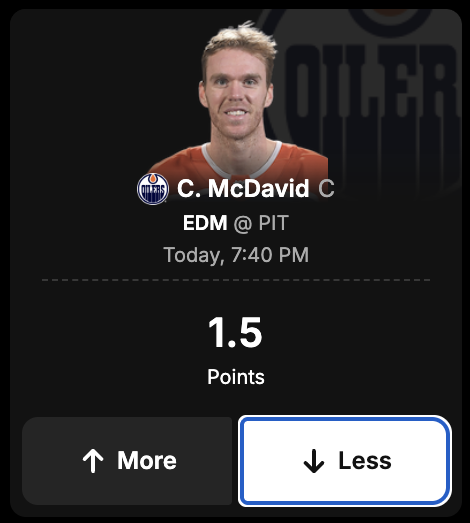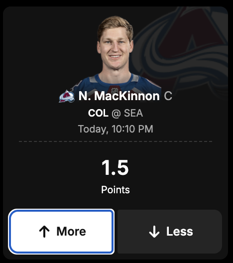 Create a Pick Set by choosing 2+ players from the same sport and Pick Group (a set of picks available from a group of set competitions). For each player, simply select if you think they’ll have more or less than their listed stat projection. In each Pick Set, you can not pick the same player twice and you must pick players from at least two different teams.