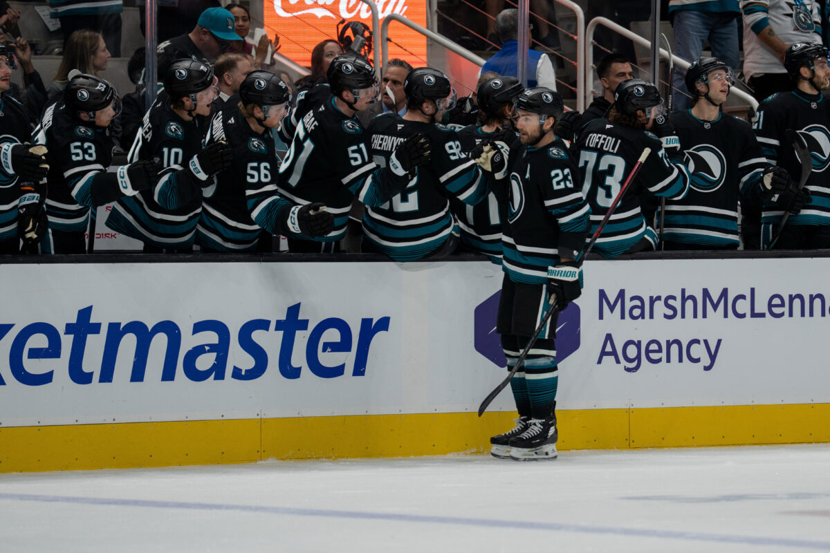 Dec 16, 2025; San Jose, California, USA; San Jose Sharks center Barclay Goodrow (23) celebrates with teammates after the goal against the Calgary Flames during the first period at SAP Center at San Jose. Mandatory Credit: Neville E. Guard-Imagn Images