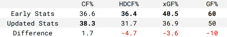 This suggests that they’ve been rather lucky to tread water in the goals department (50%), and that they’re likely to continue to be outplayed and outchanced by a wide margin going forward.
