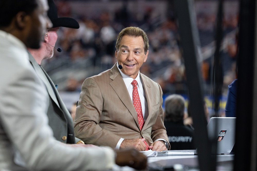 ESPN’s Nick Saban looks on from the set of College Gameday prior to the CFP Semifinal Cotton Bowl Classic between Ohio State and Texas on January 10, 2025 at AT&T Stadium in Arlington, Texas. MATTHEW VISINSKY/ICON SPORTSWIRE