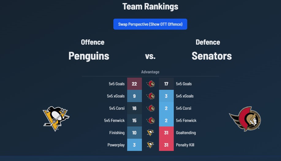 The Penguins need to get better at scoring goals at 5v5. Going up against Ottawa could be a gift — if they can get through a stingy defense that ranks among the league best in not allowing shot attempts or expected goals. The downside and weakness of Ottawa has been in net, where goaltending has been leaky so far this season. The penalty kill, where it’s often said the goalie is the most important PK’er, also is among league worst and could be an area to pick up the slack for 5v5 struggles tonight.