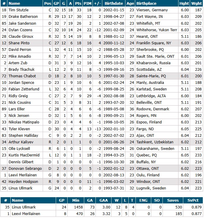 Stutzle is always the straw to stir the drink for the Sens, he’s hot with four goals over the last five games.Cozens is starting to pick up the points too, six assists in the last five games makes up almost half of his season total.Is it a kinder, gentler Brady Tkachuk? Probably not, but only 8 PIMs in 12 games since his return stands out. Tkachuk has notched 117-134 PIMs in each of the last four seasons. For a guy who has averaged almost 33 goals over the past four seasons, his touch in that department is down a notch too as he makes his mid-season return from injury but he’s been able to produce points to normal levels via racking up the assists.