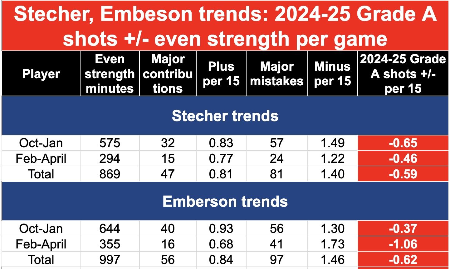 It’s something of a mystery why it took so long for Oilers d-man coach Paul Coffey to switch out Emberson for Stecher. Emberson had had a solid start to the 2024-25 season, with his strongest stretch of play in December thru January. But Stecher had out-played Emberson by a wide margin in the final three months of the season.