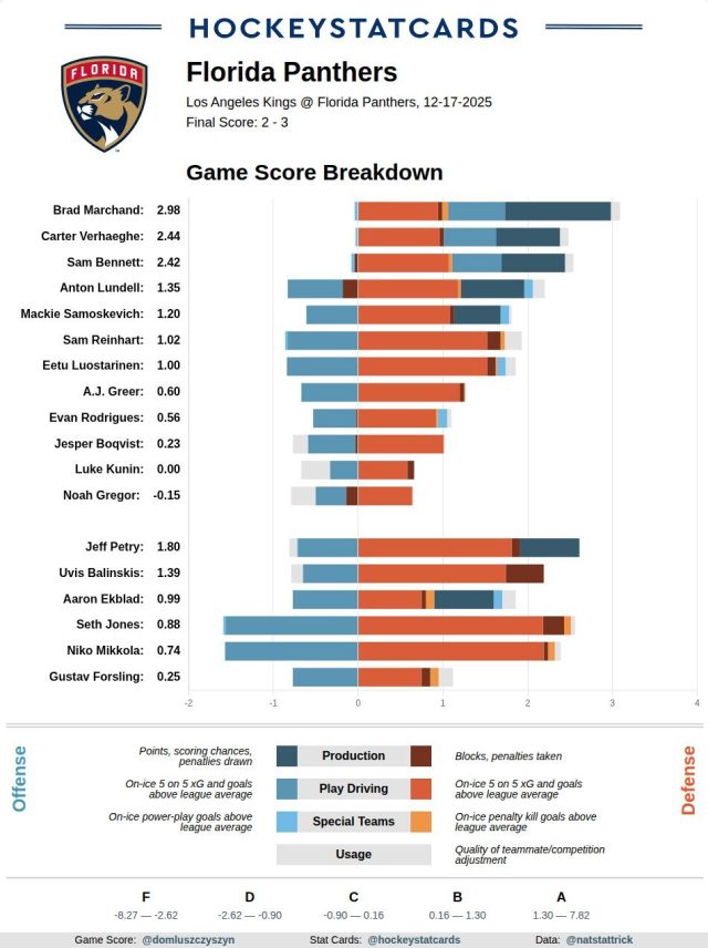 Anton Lundell, Carter Verhaeghe and Sam Bennett each scored their 11th goal of the season in the Florida Panthers gritty 3-2 win over the Los Angeles Kings at Amerant Bank Arena.