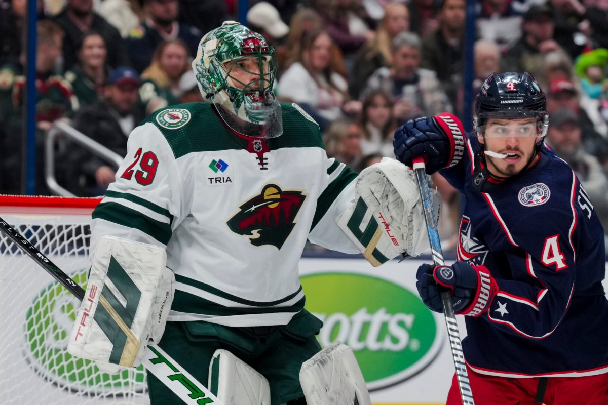 Jan 6, 2024; Columbus, Ohio, USA; Minnesota Wild goaltender Marc-Andre Fleury (29) defends the net as Columbus Blue Jackets center Cole Sillinger (4) skates in the first period at Nationwide Arena. Mandatory Credit: Aaron Doster-USA TODAY Sports