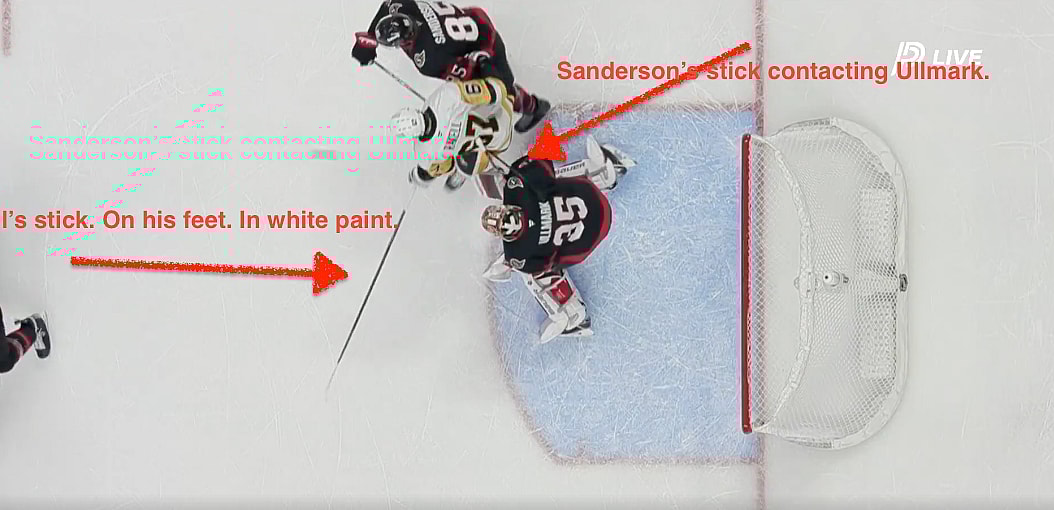 Here’s the simple graphic I crudely created for X during the game. You’ll notice Rakell’s stick well away from Ullmark as he danced around the red line demarcating the crease. You’ll also notice that it was Sanderson’s stick that turned Ullmark. To miss it in real-time is forgivable. To miss it on replay is ridiculous.