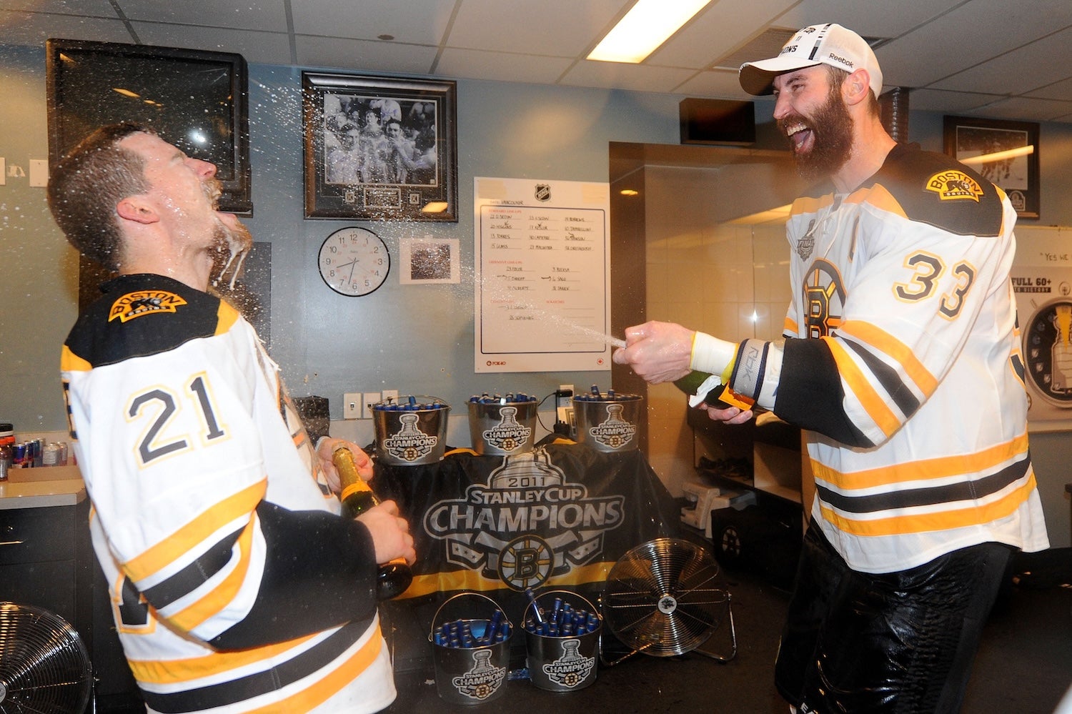 Bruins defensemen Zdeno Chara and Andrew Ference celebrate following Game Seven of the 2011 NHL Stanley Cup Final at Rogers Arena on June 15, 2011 in Vancouver, British Columbia, Canada. (Getty Images)