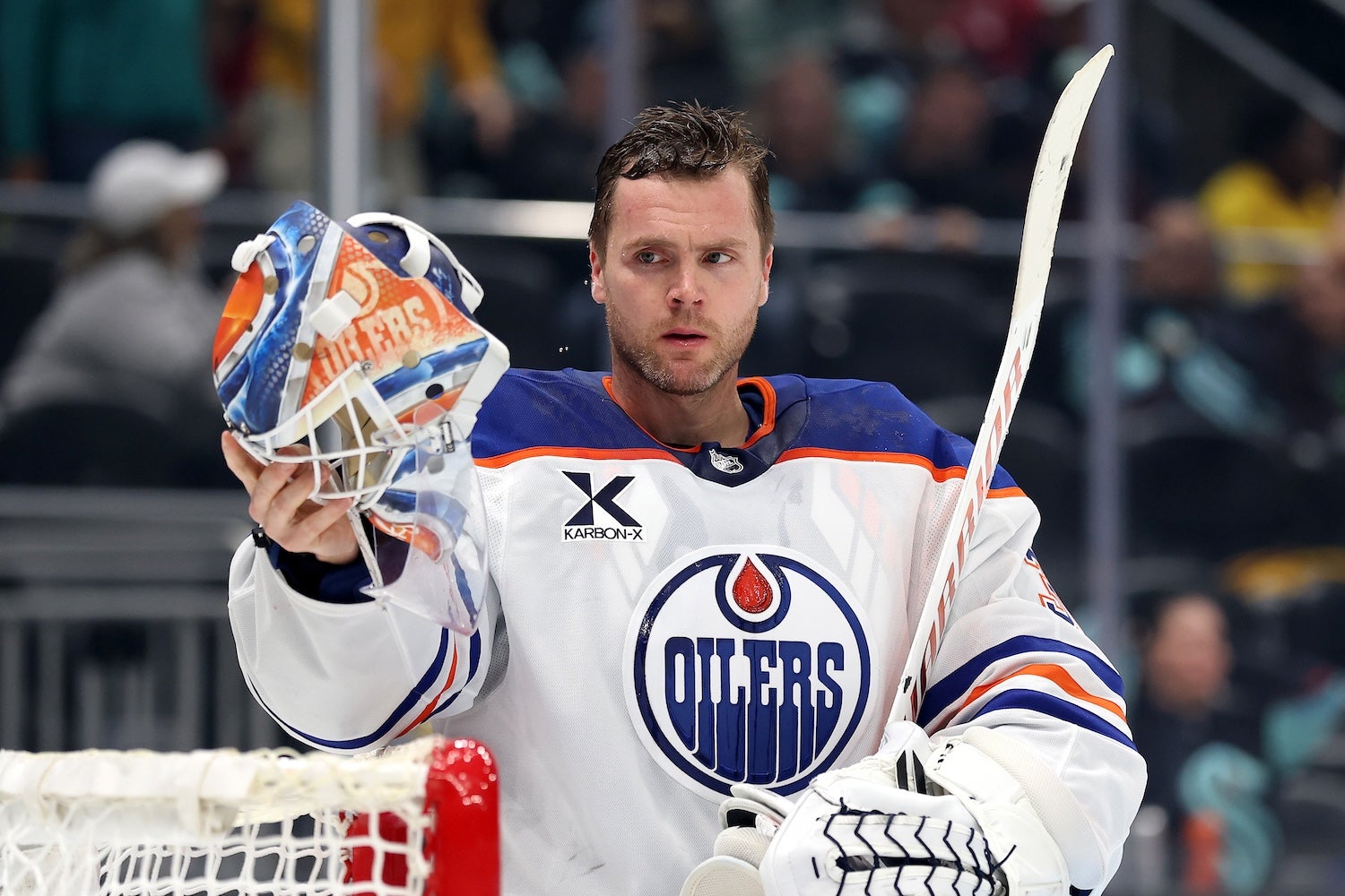 SEATTLE, WASHINGTON – OCTOBER 01: Calvin Pickard #30 of the Oilers looks on during the second period Kraken in a preseason game at Climate Pledge Arena on October 01, 2025. (Steph Chambers/Getty Images)