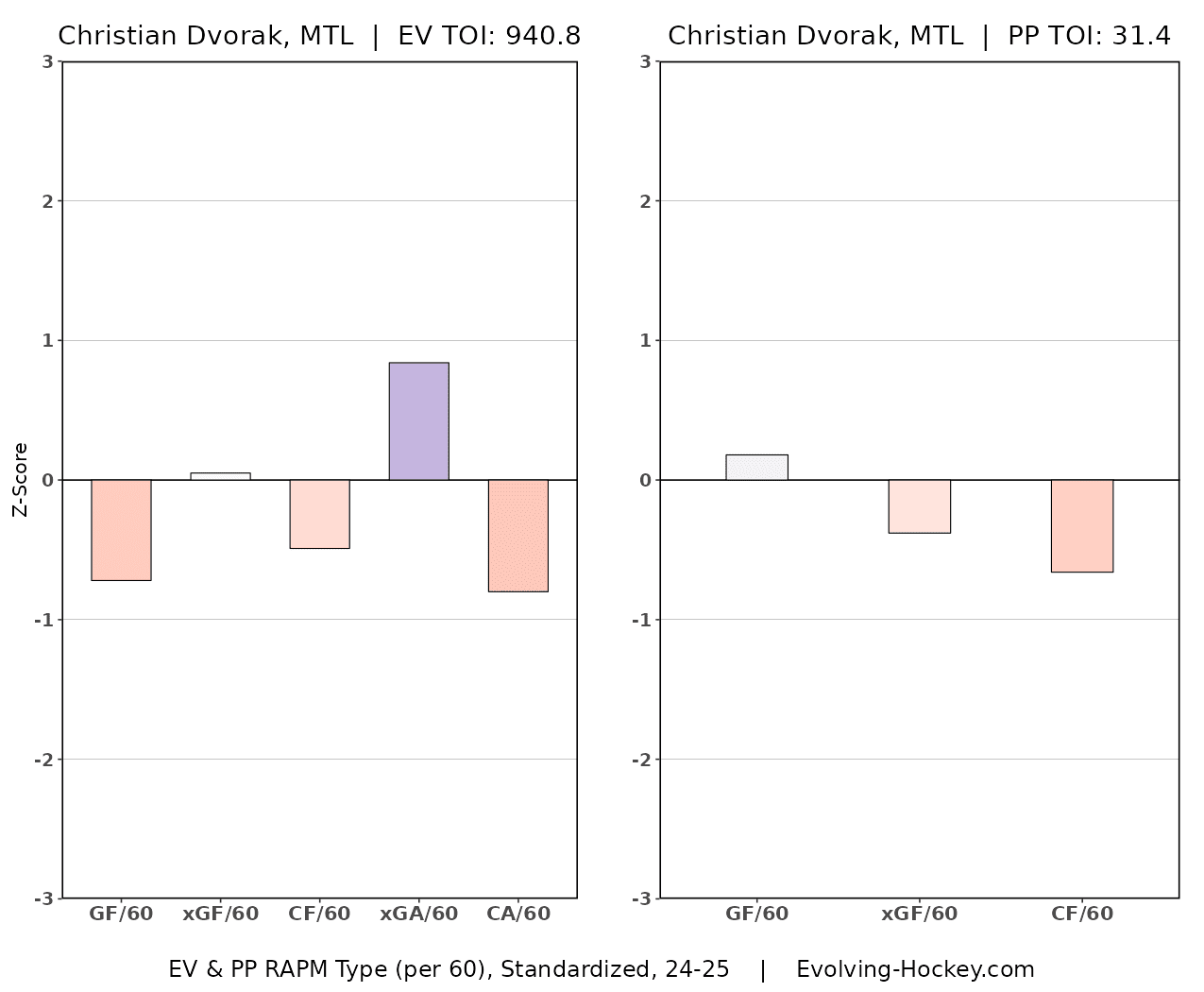 To give everyone a point of reference, here’s Christian Dvorak’s player chart. I’m a little surprised about his defensive impact, as that has not been the case since he arrived in Montreal, but it’s good to see him improve that aspect of his play. Playing with Brendan Gallagher surely hasn’t hurt in that respect.