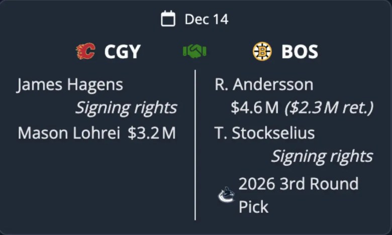 Mason Lohrei is a young defenceman who may need a change of scenery. Fun fact: he is the only NHLer from Louisiana. A young LHD is what the Flames should be looking for to help even out the right side. It probably helps that he is 6’5″ as well. Theo Stockselius is one of the Flames’ top prospects. I don’t think he entices Sweeney to make this move. Plus, the Flames love holding onto prospects and never giving them a shot at the NHL, a la Rory Kerins.