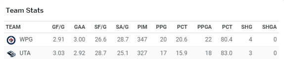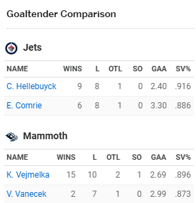 Enough of trying to pump up the True North fanbase with the few bright spots in this nightmare season….time to get back to today’s contest. Lets start off by looking at Winnipeg & Utah’s seasons to date via ESPN‘s team & goaltender comparison numbers: