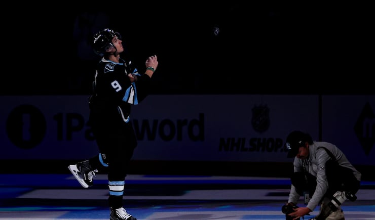 Utah Mammoth right wing Clayton Keller (9) throws a puck to a fan during the stars of the game ceremony after an NHL game against the Winnipeg Jets at the Delta Center in Salt Lake City on Sunday, Dec. 21, 2025. | Rio Giancarlo, Deseret News