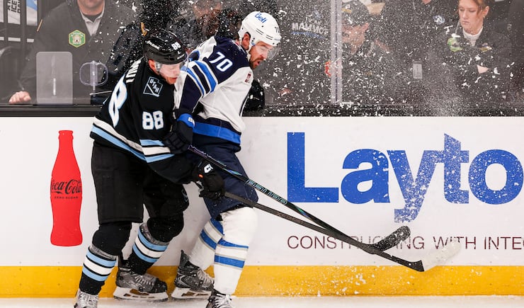 Winnipeg Jets left wing Tanner Pearson (70) checks Utah Mammoth defenseman Nate Schmidt (88) into the boards during the first period of an NHL game at the Delta Center in Salt Lake City on Sunday, Dec. 21, 2025. | Rio Giancarlo, Deseret News