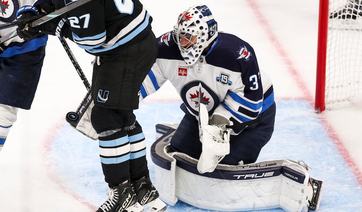 Winnipeg Jets goaltender Connor Hellebuyck (37) makes a save while screened by Utah Mammoth center Barrett Hayton (27) during the first period of an NHL game at the Delta Center in Salt Lake City on Sunday, Dec. 21, 2025. | Rio Giancarlo, Deseret News