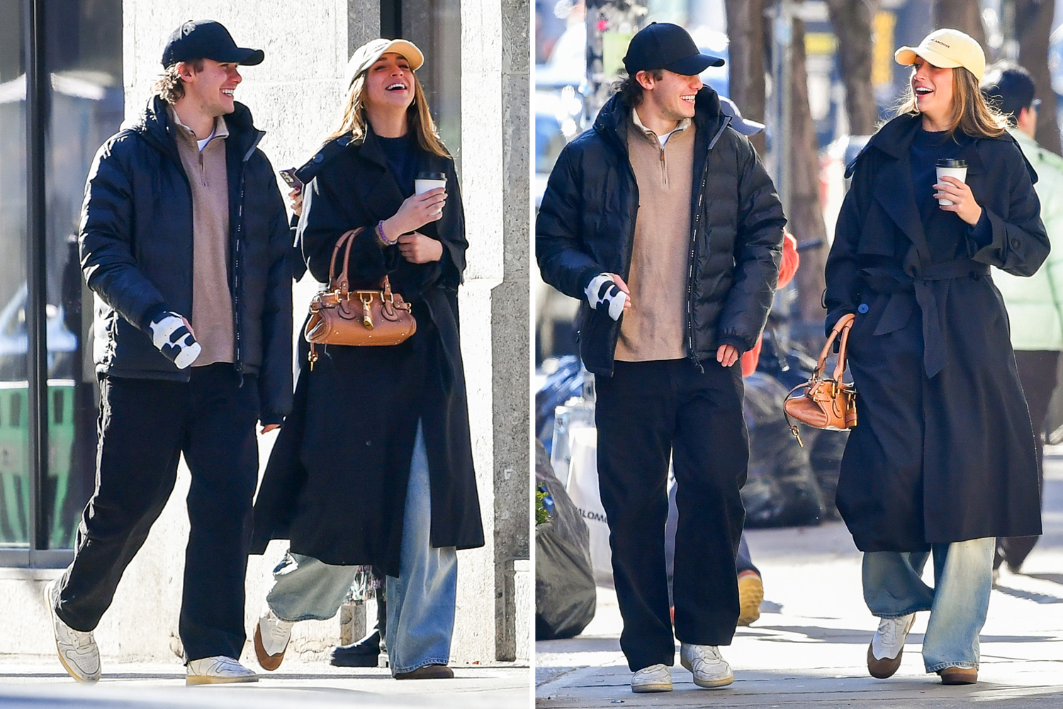 She kept the look casual, accessorizing with white sneakers, a small tan handbag, and a yellow baseball cap while carrying a small coffee cup.