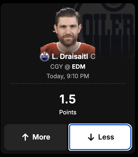 Create a Pick Set by choosing 2+ players from the same sport and Pick Group (a set of picks available from a group of set competitions). For each player, simply select if you think they’ll have more or less than their listed stat projection. In each Pick Set, you can not pick the same player twice and you must pick players from at least two different teams.