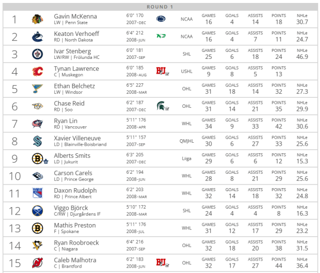McKenna ate up the WHL last season with Medicine Hat, putting up 129 pts in 56 contests for the Tigers. His move to the tougher NCAA hasn’t gone as well, though the kid is still scoring at a point per game pace for Penn State against the older competition. Verhoeff is another Canadian that made the trip south for this season, after amassing 45 pts in 63 games for the Victoria Royals. The 6’4″ defender has done well in North Dakota, scoring at a .688 pts/gm pace for the Fighting Hawks with a +6 rating. Stenberg is probably the closest to being NHL ready at this point due to him being the oldest of the bunch and his performance against actual fully grown men in the SHL. Ivar will be almost 19 yrs old when the Entry Draft happens and his almost a point per game scoring pace this year (.96) shows he has the ability to compete at a high level despite not being very big.